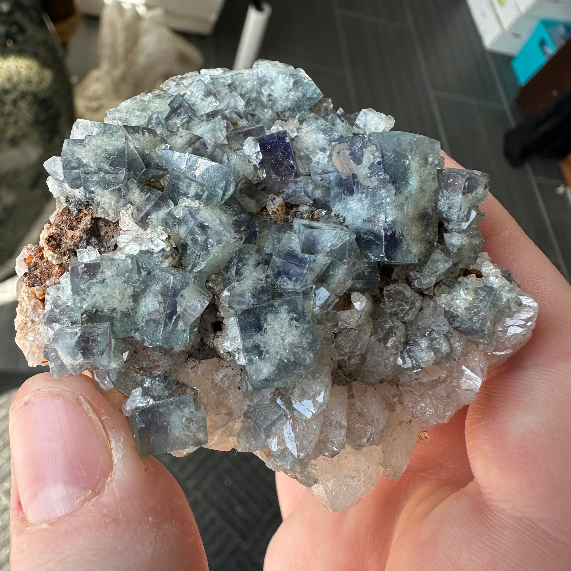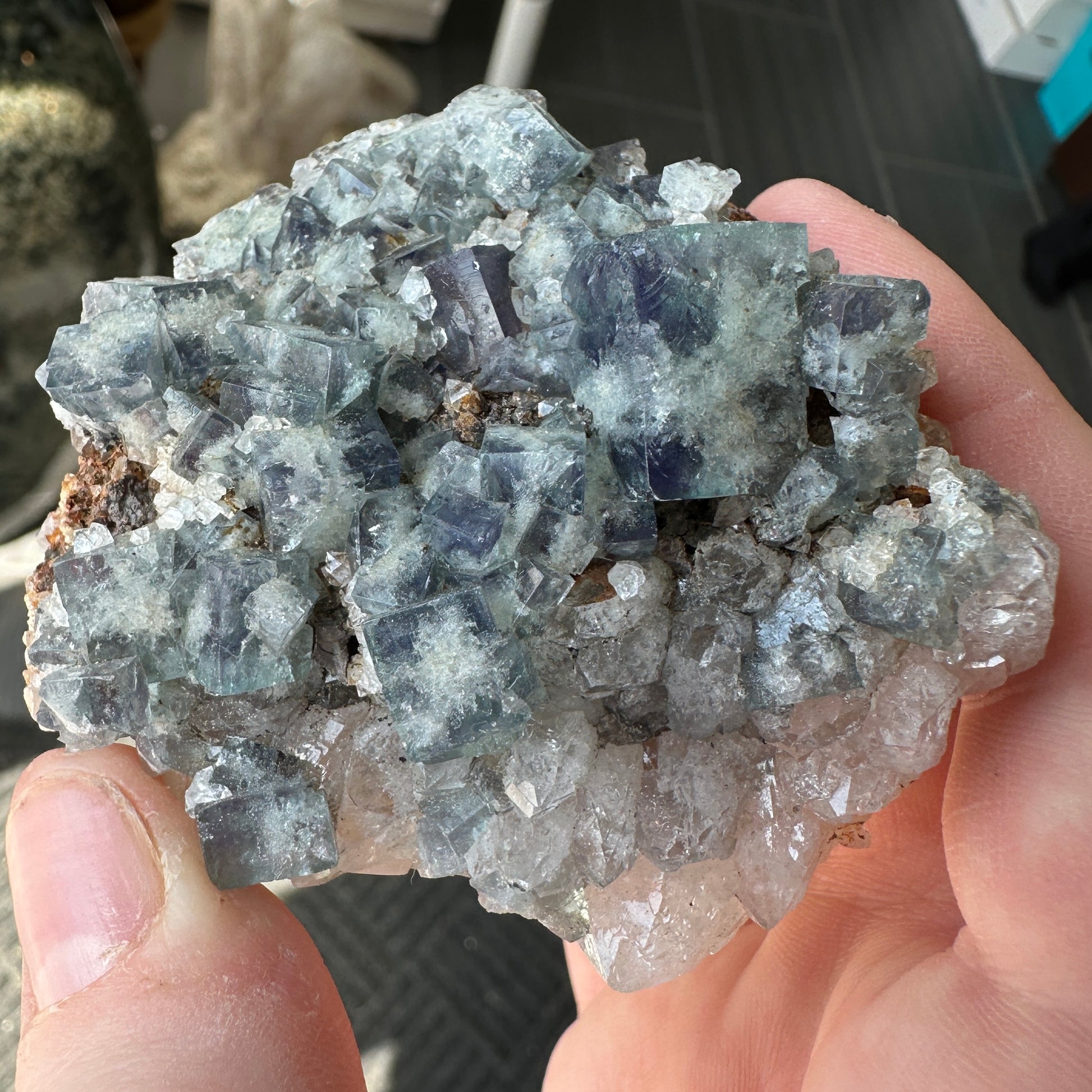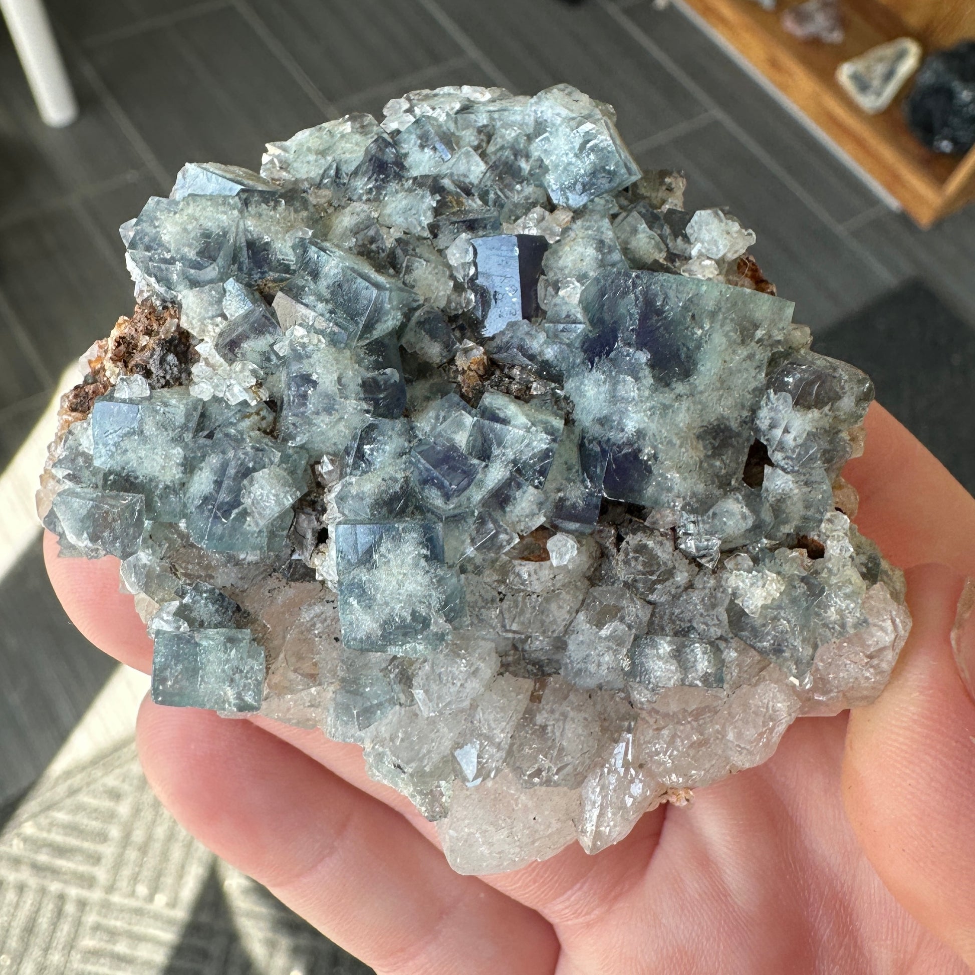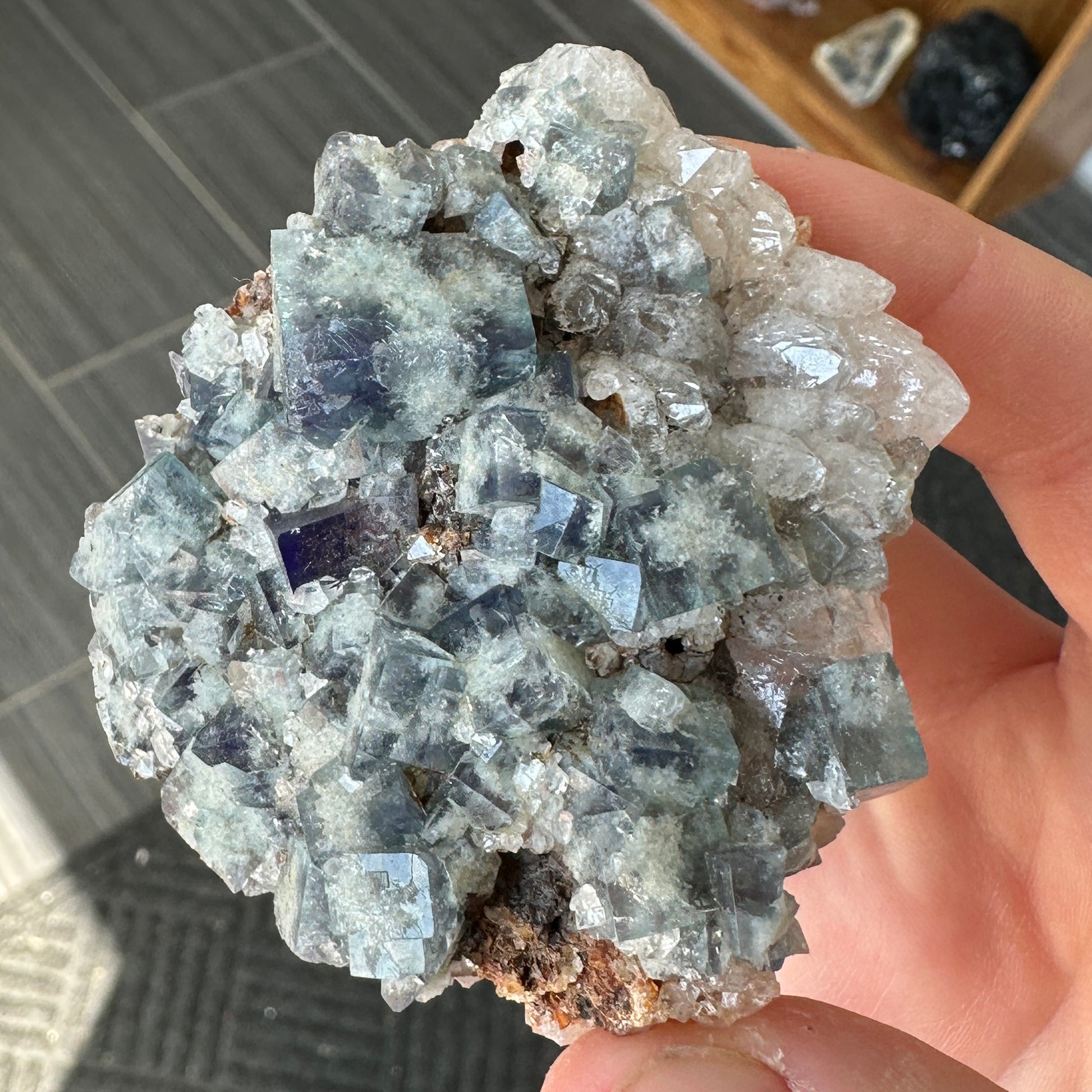 Cabinet Size Green-Blue Daylight UV Reactive Fluorite with Quartz from the Hidden Forest Pocket, Diana Maria Mine, UK